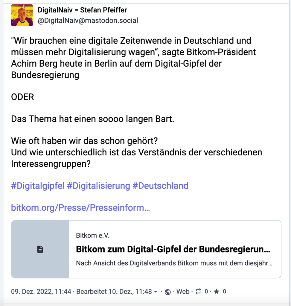 Alle Jahre wieder ist nicht nur Weihnachtszeit, nein, es ist auch Digitalgipfel. Und alle Jahre wieder hören wir die gleichen Aussagen. Wir brauchen ein Zeitenwende. Wir müssen digitaler werden. Und so weiter. Und alle Jahre wieder bleibt der Eindruck, dass nicht wirklich viel passiert. Und es bleibt bei mir der Eindruck, dass „die Politik“ (viele der Politikerinnen und Politiker) noch immer nicht verstanden haben, dass die Zukunft der Demokratie im Netz entschieden wird. O-Ton von Renate Künast, die schon wieder mit dieser Aussage zitiere. Wer hätte das mal gedacht. Da nutzt es auch nicht viel, dass Olaf Scholz über einen Abschied von Twitter nachdenkt, besser nachdenken lässt. Das Bundespresseamt, namentlich Regierungssprecher Steffen Hebestreit, sieht Mastodon auf jeden Fall derzeit nicht als Alternative an (bei ca. 14:00 Min. im Geyer & Niesmann Podcast).
