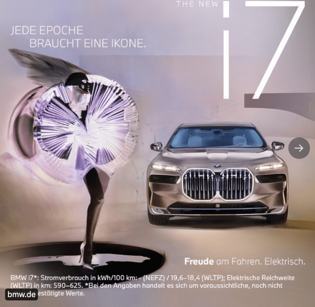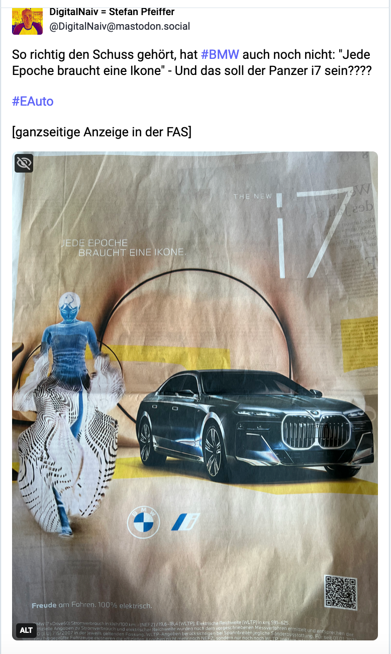Jeden Samstag kaufe ich nach den Croissants auch die Frankfurter Allgemeine (sonst lese ich sie nur digital) und regelmäßig springen mir riesige, manchmal sogar doppelseitige Anzeigen von BMW oder Audi entgegen, in denen die deutschen „Premium-Hersteller“ ihre riesigen E-Auto-Kisten bewerben. Mercedes ist ja da auch nicht besser. Im Luxussegment scheint man Geld verdienen zu wollen und zu können und es ist wohl nach Ansicht der Auto-Marketers eine Image-Frage: „Jede Epoche braucht eine Ikone“. Und das sollen diese Wagen sein?