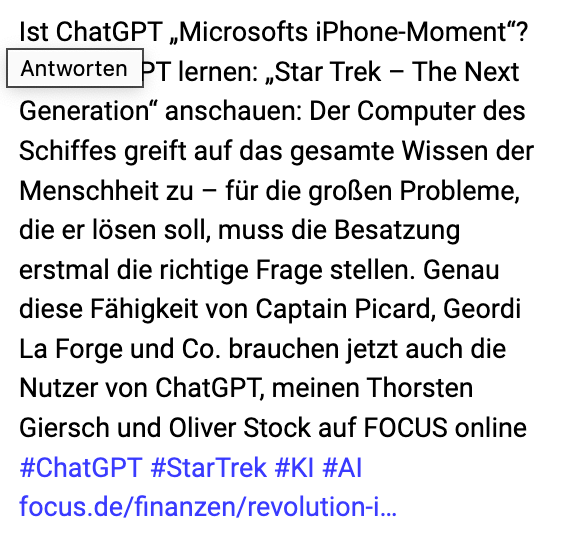 Mindestens bei Google ist – glaubt man den Berichten – ist die Aufregung und der Druck groß, auch zu liefern. Die Google Entwicklerkonferenz im März könnte ein Meilenstein sein, an dem Google etwas sagen muss. Thorsten Giersch und Oliver Stock sehen in ihrem Artikel auf Focus Google, das von Werbemaßnahmen lebt, massiv unter Druck. Selbst wenn man eine KI à la ChatGPT in die Suche einbaue, torpediere man sein eigenes auf Werbung basierendes Geschäftsmodell. Es laufe derzeit auf einen Zweikampf von Microsoft und Google mit einem Vorsprung von Microsoft hinaus. Doch was ist mit Amazon und Apple? Auch sie werden in der ein oder anderen Form in ihrem Consumer-Produkten (Siri, Alexa) oder auf der Cloud-Plattform (AWS) reagieren müssen.