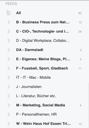 Seit vielen Jahren nutze ich Feedly als RSS Reader und habe auch die Pro+-Version gekauft. Dort habe ich meine Feeds thematisch geordnet und einige sogenannte Boards eingerichtet. Es gibt beispielsweise einen Feed Business Press zu Digitalisierung und dem Netz, in dem beispielsweise die Texte und Berichte von FAZ Digitec, von Dr. Holger Schmidt, Claudia Tödtmann und anderen Quellen zusammen laufen. Analog gibt es weitere Feeds, beispielsweise zu meinem Lieblingsclub Borussia Mönchengladbach, zu Wein und natürlich anderen, ähnlich seriösen Themen.
