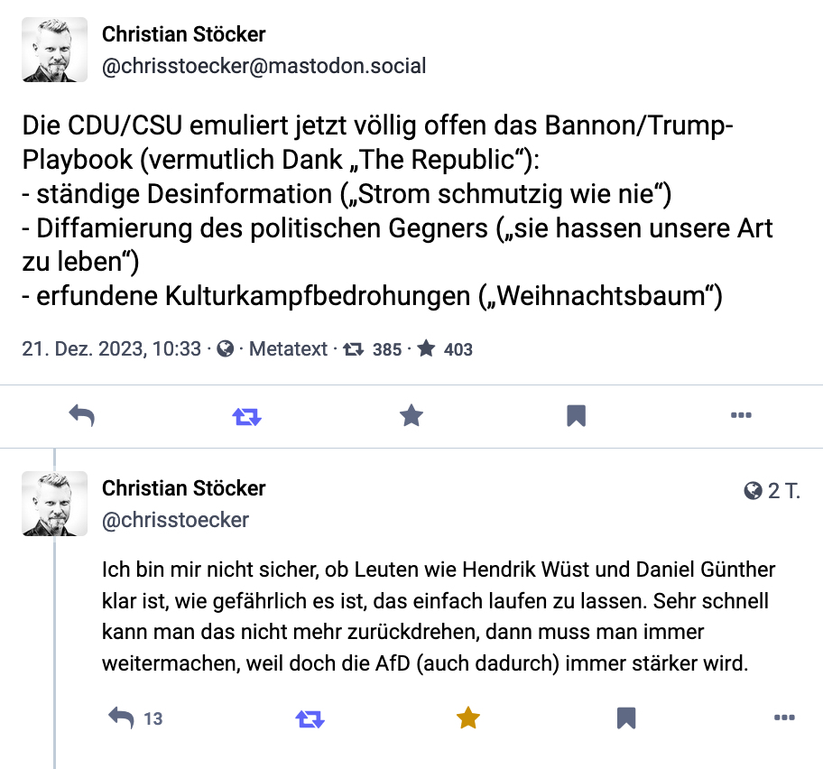 Bemerkenswert finde ich diesen beiden Nachrichten (Tröts) von Christian Stocker auf Mastodon.