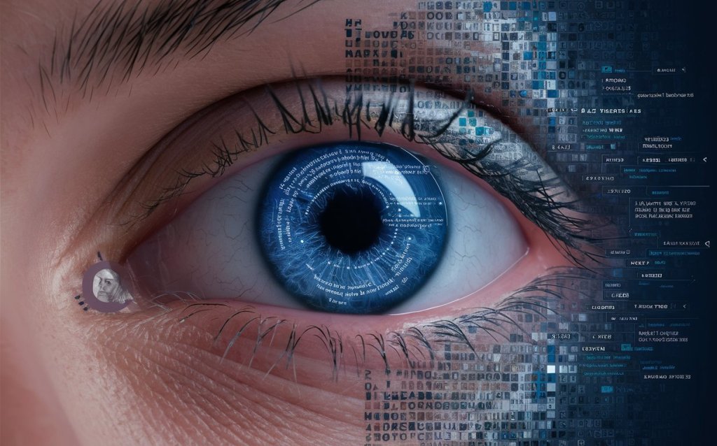 Hier der Prompt, mit dem idoegram.ai das ursprüngliche Titelbild erstellt hat: A thought-provoking, futuristic image of an eye, where the iris is replaced by an intricate, swirling pattern of AI-generated text and images. The eye reflects miniature search results, prompts, and visuals, representing the seamless fusion of human intelligence and AI-assisted content creation. The transition from human skin to digital pixels in the surrounding area emphatically conveys this merging of two worlds, creating a fascinating and captivating visual experience.
