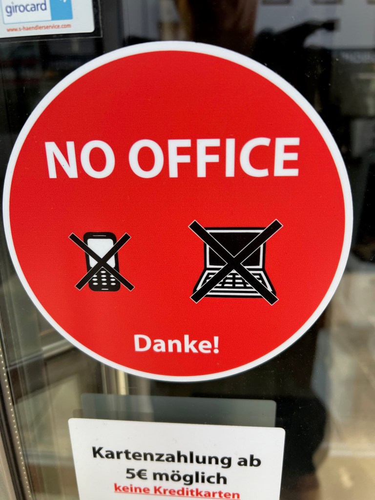 Als ich den den Aufkleber rechts an der Tür der Ewwerschter Kaffeebar sah, musste ich unwillkürlich an die Känguru-Chroniken von Marc-Uwe Kling und den Hafen der digitalen Boheme denken, in dem die digitalen Berliner Worker vor ihren Notebooks und an ihren Smart Phones vor sich hin werkeln. Wenn Ihr mich fragt, sollten das Cafés durchaus erlauben. Wenn Ihr mich fragt, sollten sich die Jünger der digitalen Boheme aber dafür hüten, lautstark an ihren Handys mit ihren In-Ear-Kopfhörern zu telefonieren und ab und an etwas konsumieren. WIR FRAGEN DICH ABER NICHT. Die auf Mastodon entbrannte Diskussion war … überflüssig?