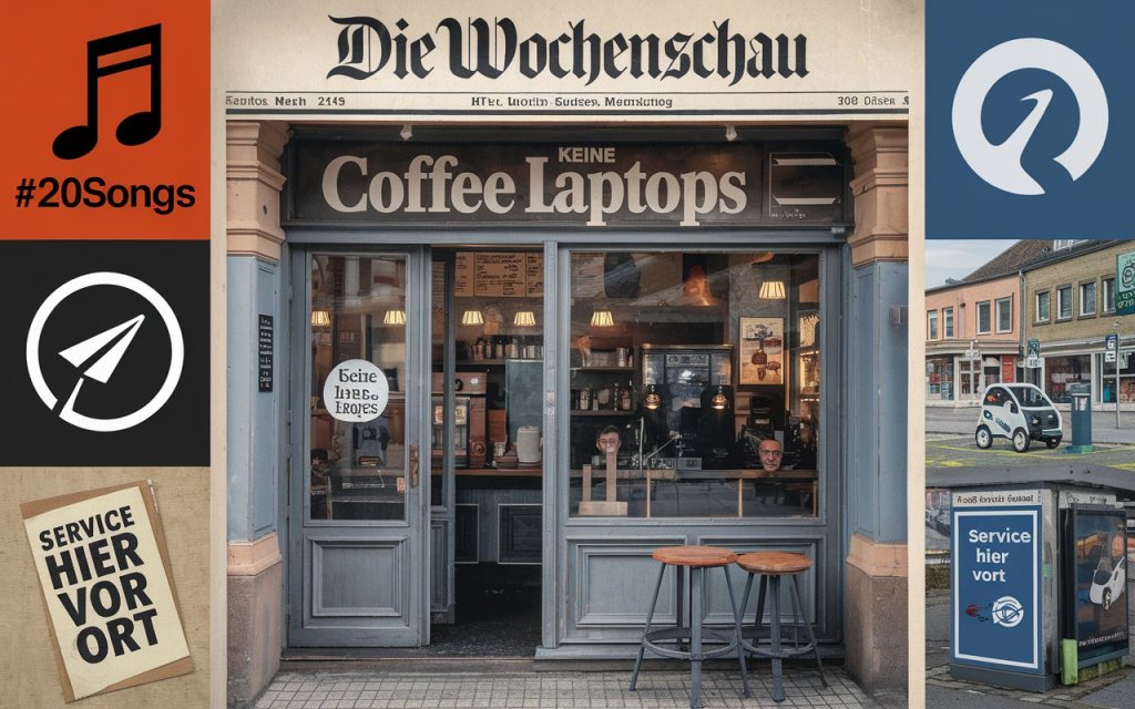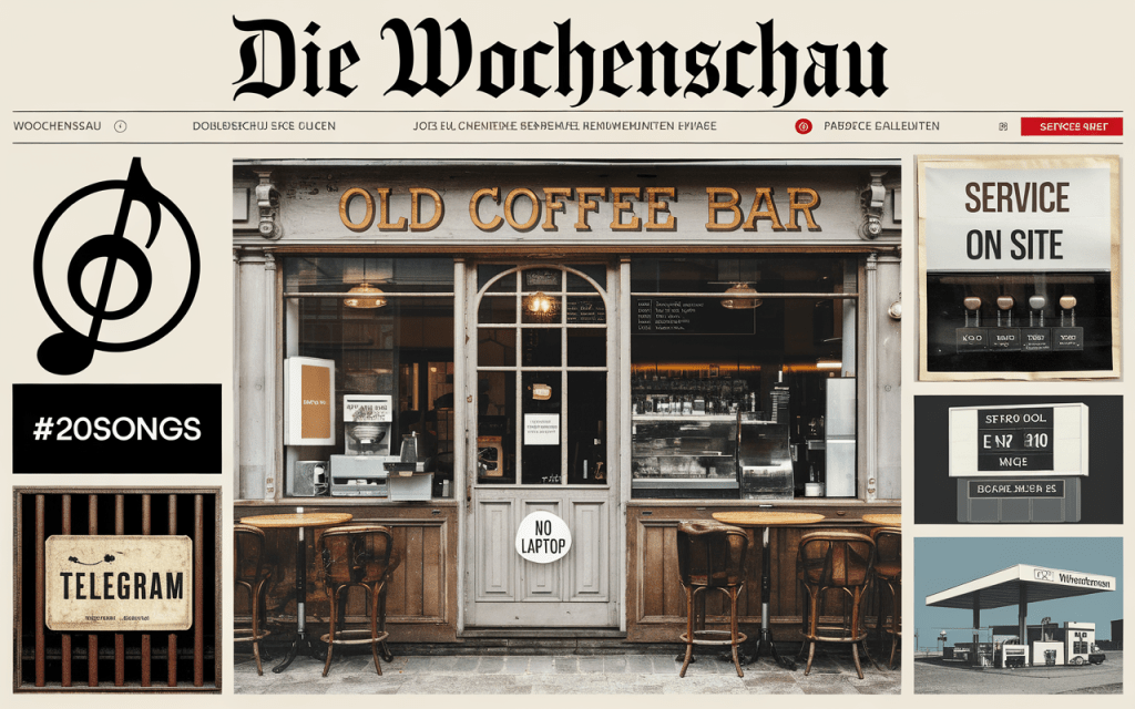 Die Titelgrafik wurde erneut mit ideogram.ai nach folgendem Prompt erstellt: A vintage newspaper with the title „Die Wochenschau“. In the centre, there is a large picture of an old coffee bar with a „Keine Laptops“ sticker on the door. Surrounding it, there are smaller images: a music note symbol for „#20Songs“, a Telegram logo behind bars, a poster with „Service hier vor Ort“, and a petrol station with a price display for various types of energy.