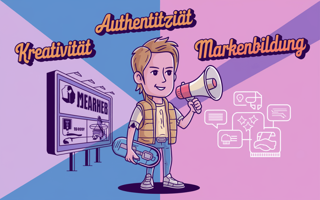 A cartoon illustration of Marty McFly dressed as a modern marketer. He is wearing a smart casual outfit and has a hoverboard under one arm and a retro megaphone in the other hand. Behind him, there is a split background: on one side, a 1950s advertising billboard, and on the other, a holographic social media feed. Above the character, the words ‚Kreativität‘, ‚Authentitizität‘ and ‚Markenbildung‘ float in a retro-futuristic font. The color palette is inspired by the McKinsey report and consists of blues and golds.