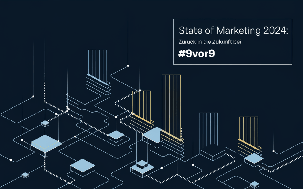 A digital abstract representation, predominantly in shades of blue and white. It features interconnected dots and lines forming intricate patterns, resembling a network or a digital landscape. The central focus is a series of waveforms, possibly representing data or sound. On the right side, there’s a bold textual element that reads ‚Zurück in die Zukunft‘ in white, accompanied by the subtitle ‚STATE OF MARKETING 2024 bei #9vor9‘ in smaller font. The overall theme suggests a futuristic or technological context, possibly related to marketing trends in the year 2024.