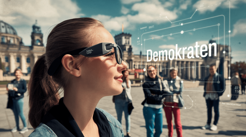 Das Titelbild soll die Inhalte dieser Wochenschau Verbindern: „Diese Wochenschau dreht sich um die „Schmerz“-haften Kandidaten der SPD und CDU, mahnt vor pauschalen Verurteilungen „der Ossis“ und blickt positiv durch die smarte Brille in die neuen Bundesländer, ohne die Gefahren zu ignorieren.“ Ideogram.ai hat das Bild nach folgendem Magic Prompt erzeugt: A photo of a modern young woman in profile wearing smart glasses. She is looking at a screen that displays the text „Demokraten“. The background is a sunny day with several friendly women and men wearing jeans and jackets. There are also important buildings in the background, such as the Zwinger and the Schwerin Schloss. The overall photo has a vintage feel.