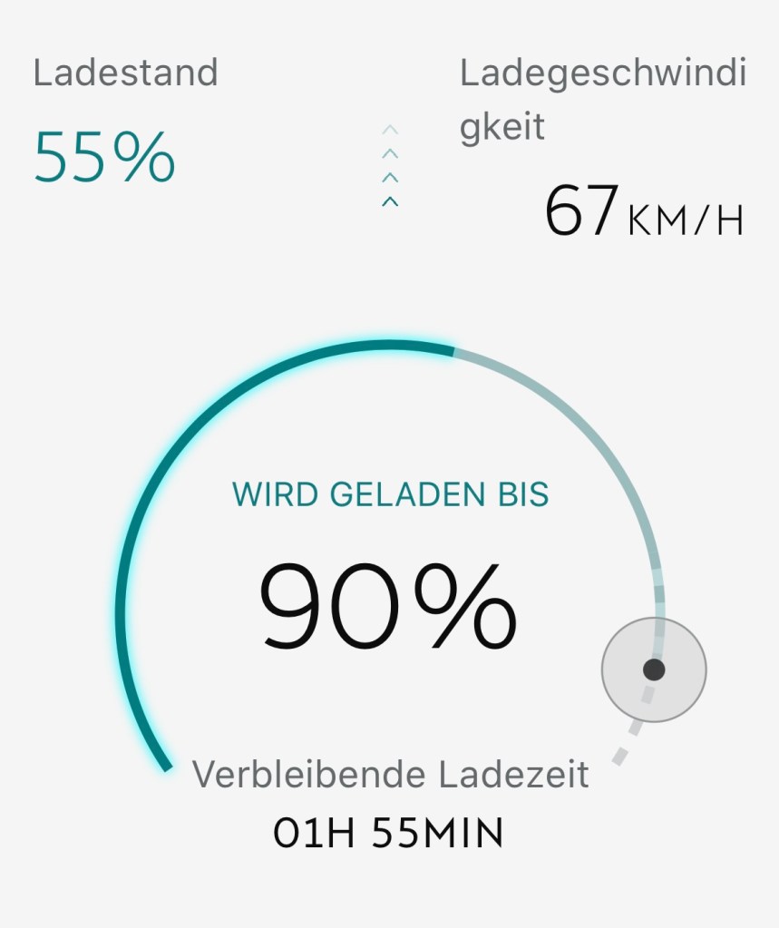 Der Schnellladeplatz war besetzt, also blieb nur die langsamere Variante. Für das Laden von 55 Prozent auf 90 Prozent der Batterie veranschlagte das System knapp zwei Stunden. Das braucht also eine Weile. Meine Cupra-App auf dem iPhone zeigte an, dass 67 Kilometer pro Stunde geladen werden. Das Schnellladen werde ich sicher bald auch probieren, denn das ist ja die Variante, die man nutzen möchte, wenn es mal auf eine längere Strecke geht.